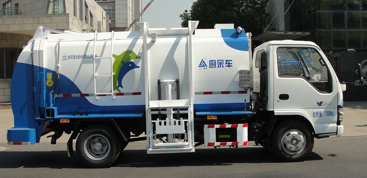 CGJ5070TCAE4型餐廚垃圾車是對賓館、餐廳、食堂的廚余垃圾、食品加工的廢料、副食品集貿市場和超市的過期商品等直接收運的專用車輛。該產品通過底盤取力器驅動液壓泵,產生高壓油,帶動液壓系統工作,從而提桶機構和頂蓋工作,將垃圾桶內垃圾倒入箱體;到指定地點,打開后門,推出推板進行卸料,完成作業。